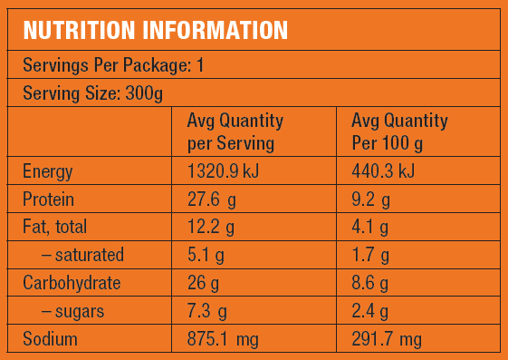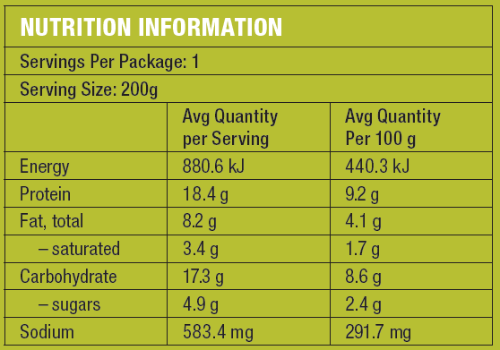 Potato, Lamb Mince, Shepherds Pie Base [Water, Onion, Celery, Carrot, Tomato Paste, Worcestershire Sauce (GF), Vegetable Stock, Salt, Rice Bran Oil, Cornflour, Herbs], Peas, Edam Cheese (Milk), Milk, Salt. Contains: Milk