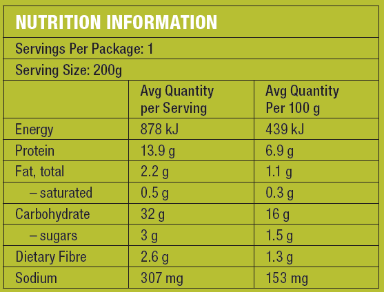Chicken (21%), Vegetables (20%) [Mushrooms, Capsicum, Celery, Onion, Carrot, Garlic], Tinned Tomatoes (19%) [Tomatoes, Tomato Juice, Acidity Regulator (Citric Acid)], Tinned Cannellini Beans (11%) [Beans, Water, Salt], Canola Oil, Herbs and Spices, Chicken Stock Seasoning, Salt, Basmati Rice (28%).